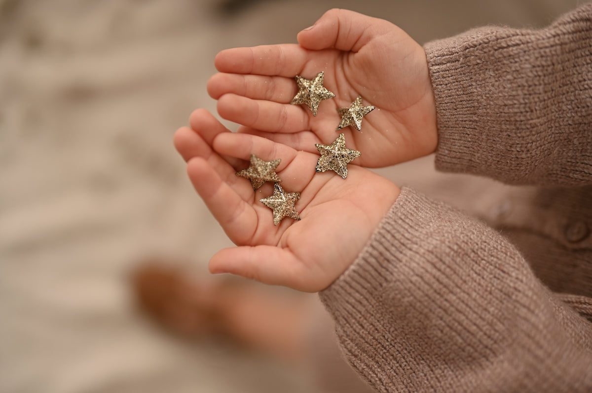 Beautiful set of 20 decorative gold stars. Perfect for creating magical, heavenly atmospheres for baby and newborn photo shoots. Ideal for Christmas decorations and dreamy themes.