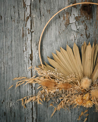 Boho-style Country Floral Ring. In soft olive and earth tones, with a wooden ring. Handmade.